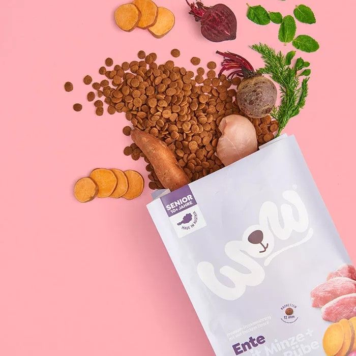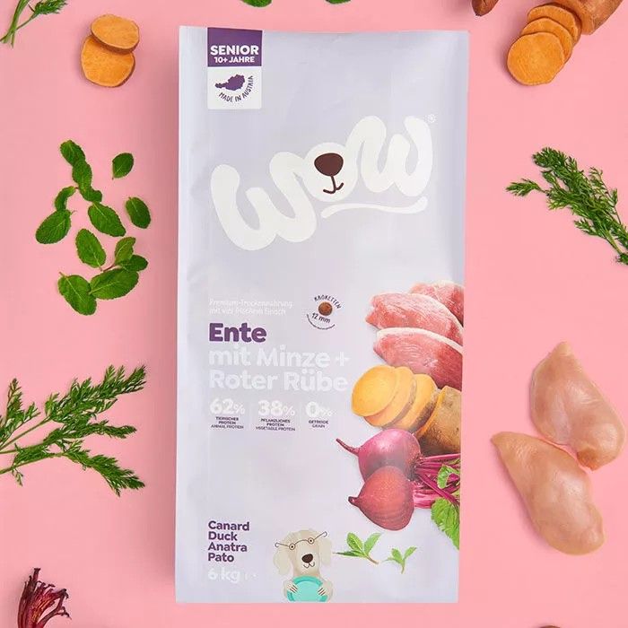 Kakovostni WOW briketi Senior z raco vsebujejo sveže račje meso in lahko prebavljive vire ogljikovih hidratov, kot sta krompir in sladki krompir, ki skupaj z sadjem in zelenjavo tvorijo uravnotežen in celovit obrok za pse. Ne vsebujejo žit!