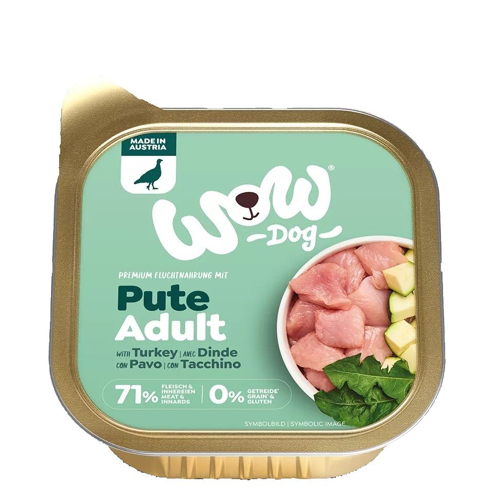Popoln meni WOW mokre hrane s puranom, primerne za odrasle pse vseh velikosti in pasem. Obogaten je z svežo zelenjavo, visokokakovostnimi zelišči in minerali. Ne vsebuje žit!